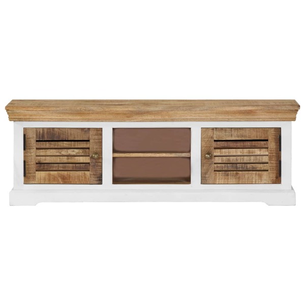 This wooden TV cabinet exudes a rustic charm. It will make a real attention-grabbing addition to your interior. The sideboard is made of solid mango wood, a hardwood with dense grains. Rough mango wood not only has the strength to bear the weight, but also stands the wear and tear of time. As a consequence, this beautifully-designed lowboard is exceedingly stable, durable and aesthetically-appealing. Additionally, this stereo cabinet is fully handmade and the exquisite wood grains enable every piece of furniture distinctive and slightly different from each other. This HiFi cabinet features 2 cabinets with doors and 2 compartments, providing commodious space for storing your multimedia appliances, books, shoes, as well as various other items. Important note: The wood grains vary from piece to piece, making each piece unique. The delivery is random, ensuring the exclusivity and individuality of your product.