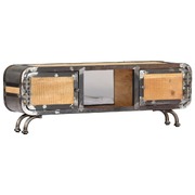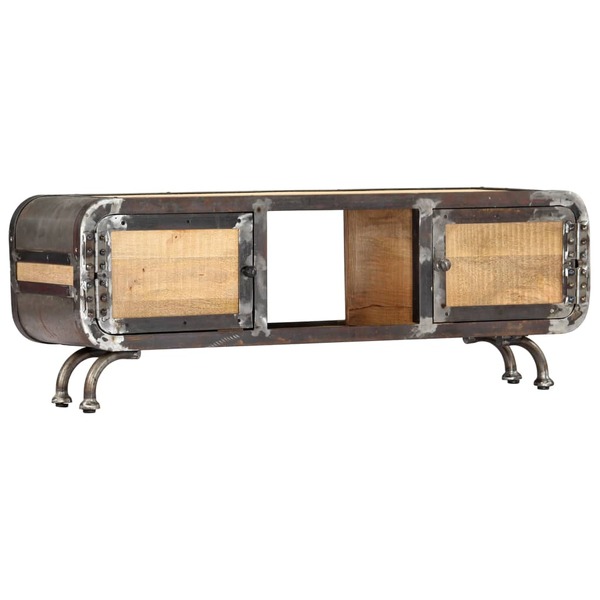 If you're looking for a simple touch of the rustic as well as industrial charm to add to your interior decor, our solid wooden TV cabinet will do the trick. Equipped with 2 compartments with doors and 1 shelf for various items, this TV stand will definitely be a practical and eye-catching addition in your home. Made of solid mango wood with a natural finish, this HiFi cabinet exudes an original look. The exquisite craftsmanship and the beautiful mango wood grains make every piece of furniture unique and slightly different from the next. Additionally, the cast iron frame contributes to the stable and sturdy structure and adds to the stereo cabinet's industrial style as well. Important note: Variations in colour and wood grain makes each of our plasma cabinets unique and slightly different from the next; the delivery is random.