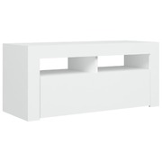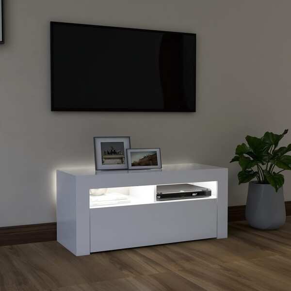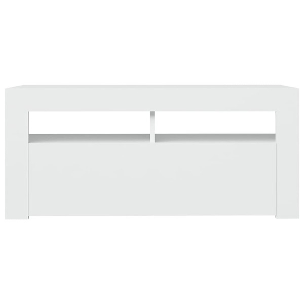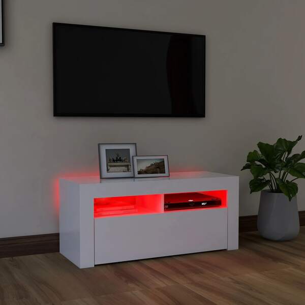 Featuring a trendy yet practical design, this TV cabinet with LED lights will definitely become a focal point of your room. The sturdy construction of this HiFi cabinet makes it highly durable. There is ample space remaining for you to keep your DVD player, game console, streaming device, and media carriers neatly organised. This TV stand features RGB LED lights, which has different menus to change the colour of lights and let the colour adjust automatically differently. The LED lights underline the modern look and contribute to the trendy feeling. Additionally, this TV unit is easy to clean with a damp cloth. Note: The product has a USB connector, but the certified 5V USB power source is not included.