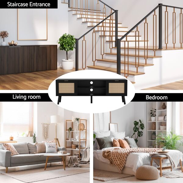 premium TV unit combines 2 side cabinets with 2-tier middle shelves, featuring golden metal handles and soft-close hinges. Crafted from E1-grade 15mm particle board with paper veneer finish, this sturdy black unit (150Lx40Dx52H/cm) supports 40kg tabletop capacity. Includes anti-tip kits, cable management holes, and solid wood feet with pads. Effortless assembly and wipe-clean surfaces ideal for living room entertainment setups.