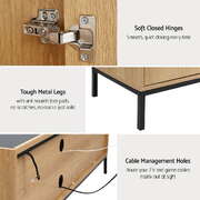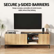 Transform your lounge room with this versatile entertainment unit, featuring three side storage cabinets with sleek metal handles and soft-close hinges for quiet access, flanking two tier middle shelves perfect for gaming consoles and media displays. The 3-sided barriers tabletop securely holds up to 65" TVs, preventing accidental slips while 10kg shelves organise accessories.