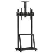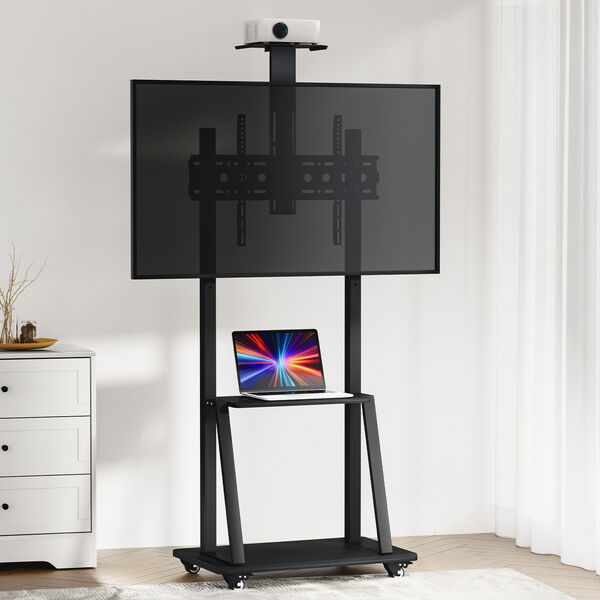 For reliable mobile entertainment, you'll love the Mobile TV Stand. Suitable for screens between 32-75" wide and with flexible VESA mounting options, our stand suits a variety of home televisions for your convenience. This stand is constructed from a high-quality steel frame with a sleek black powder-coated finish, ensuring durability and style. Adjust the height of your television to suit the occasion with three adjustable height levels. Equipped with four lockable castor wheels, the television can be wheeled from room to room with ease, making it perfect for homes, classrooms or offices. The stand also features a convenient top shelf and base storage for your media devices and accessories. With a safety bolt for secure fixing, rest assured your TV will stay secure throughout its use. Upgrade your viewing experience with the Mobile TV Stand today!