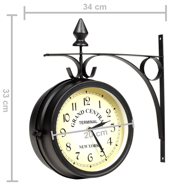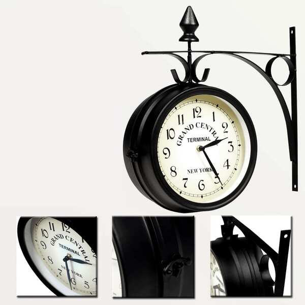This beautiful two-sided wall clock will add a touch of retro style to your home with its exquisite, high-quality craftsmanship. This clock can be easily mounted to the wall thanks to the stable bracket. The wall clock is in the form of an American station clock with the inscription "GRAND CENTRAL TERMINAL NEW YORK". The clock has dials on both sides with two timepieces, so you can set two different times.
