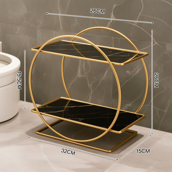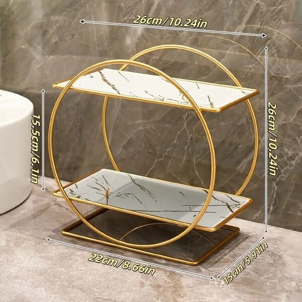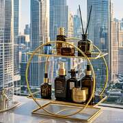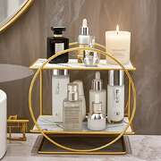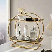 This two-tier round cosmetic organizer redefines your dressing space with a simple and elegant design language. It combines a sturdy golden metal frame with transparent glass shelves, creating a visually light yet substantial feel. It is not just a storage tool but an accent piece for desktop aesthetics, integrating "romantic elegance" into daily life, transforming your dressing area into a scenic view.