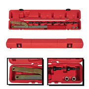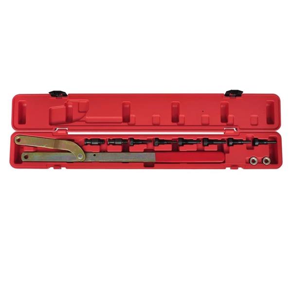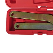 This universal pulley holder and fan clutch set is designed to remove and install fan clutches and rotate or restrain the camshaft pulley on most cars.All parts are made of heat treated steel with a satin finish, which ensures durability. And the double dipped handle allows for easy work.This toolset has an adjustable jaw spread & interchangeable pins, all supplied in a blow moulded storage case for protection and transportation.