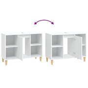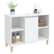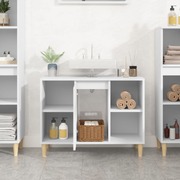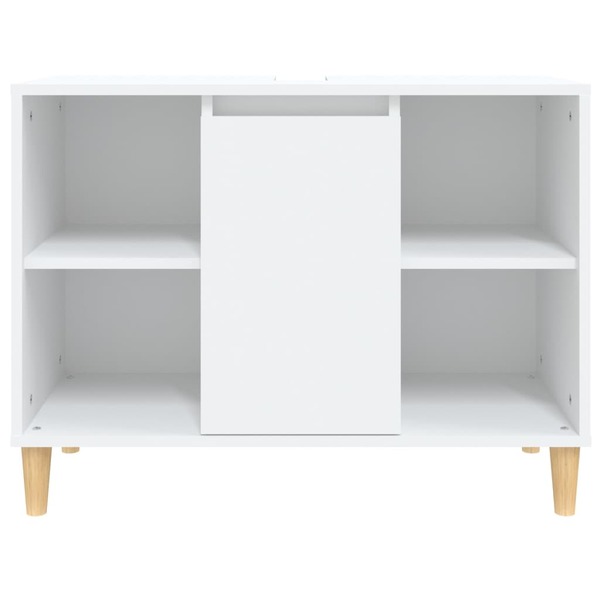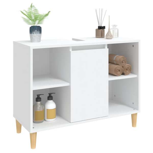 This sink cabinet is meant to be a great addition to your bathroom, giving it a tidy and striking appearance! Durable material: The engineered wood is of exceptional quality with smooth surface and also features strength, stability, and resistance to moisture.Ample storage space: The bathroom sink cabinet has 5 compartments and a door, offering various storage options and extra space to store items in your bathroom. The top of the bathroom cabinet is ideal for placing the sink.Wooden feet: The solid eucalyptus wood feet give the under sink cabinet a natural and pleasant look while ensuring stability.Easy-to-clean surface: The bathroom furniture is easy to clean with a damp cloth. Warning:To prevent it being overturned, this product must be used with the provided wall attachment device. Good to know:To make assembly as easy as possible, each product is delivered with a manual.The sink is not included.