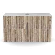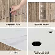 Perfectly sized for Australian homes, this wall-hung cabinet features a matte pine soft-flute timber front, contrasted elegantly with a Carrara white engineered stone countertop for timeless appeal. Crafted with moisture-resistant MDF and premium timber veneers, this unit withstands humid bathroom conditions. The Carrara white countertop resists stains and scratches, maintaining its luxe marble-inspired look with minimal upkeep. Two deep 82cm-wide drawers provide generous storage capacity, ideal for keeping bathroom essentials neatly organised. The brushed alloy handles add a refined metallic accent, while soft-closing runners ensure silent, smooth operation – no more slammed drawers! Pre-cut basin and tap holes simplify setup, compatible with most above-counter basins (sold separately). The wall-mounted design frees up floor space, enhancing cleanliness and creating an airy feel in smaller bathrooms.