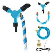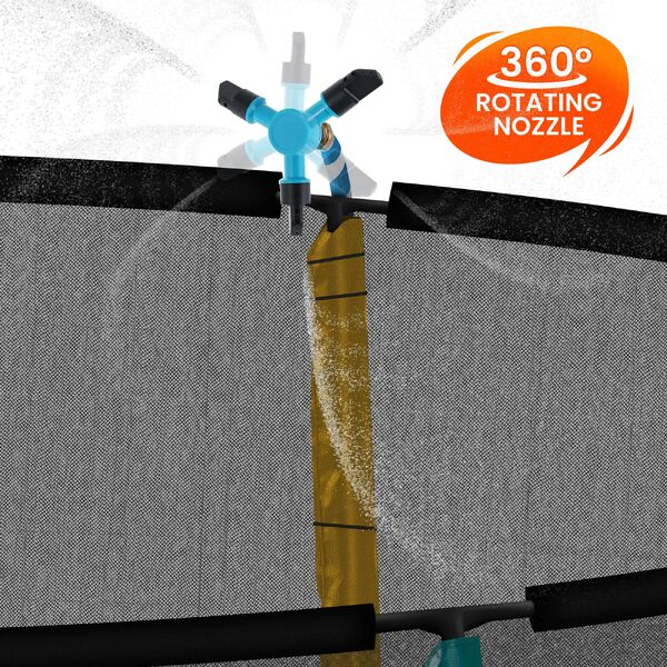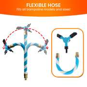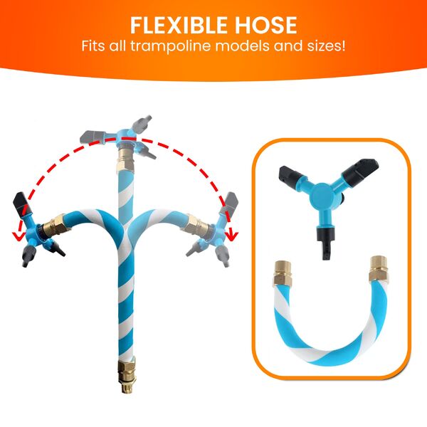 Transform your trampoline into an awesome splash zone! This super easy sprinkler system hooks right up to your garden hose and comes with a three-pronged rotating nozzle and an adjustable bend pipe for the perfect trampoline water splash.