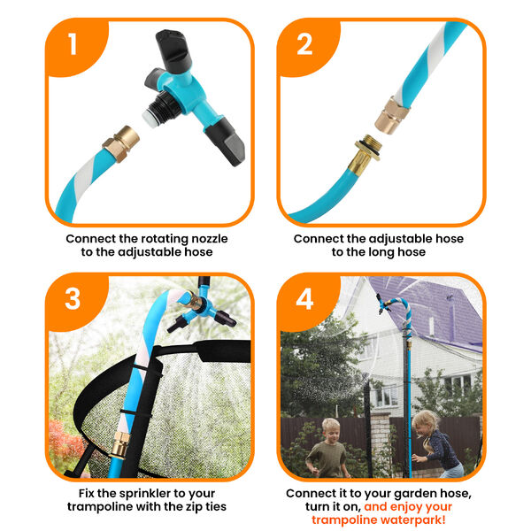 With a 1.5m water supply pipe and zip ties to keep everything in place, setting it up is a breeze. Just connect the sprinkler, attach the hose to a trampoline pole and slowly turn on the water for an instant summer refresh!