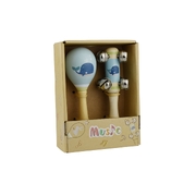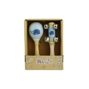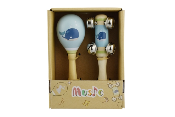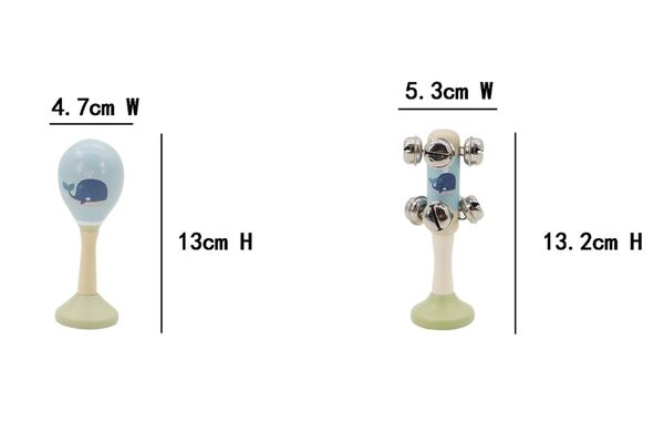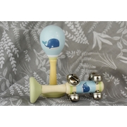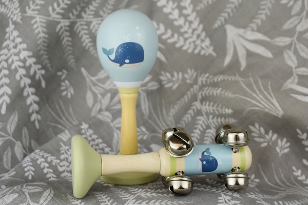 A beautifully finished wooden bell stick and maraca 2 piece musical set featuring a whale design from Calm & Breezy by Kaper Kidz. These musical instruments are perfect for babies and small children as they encourage developing hand-eye coordination as well as building gripping and arm muscles. As small children shake these toys, they play a gentle sound which is both soothing and encouraging. Each wooden 2 piece musical Set from Calm & Breezy by Kaper Kidz is made from timber and finished to the highest quality and painted in child safe, non toxic paint.