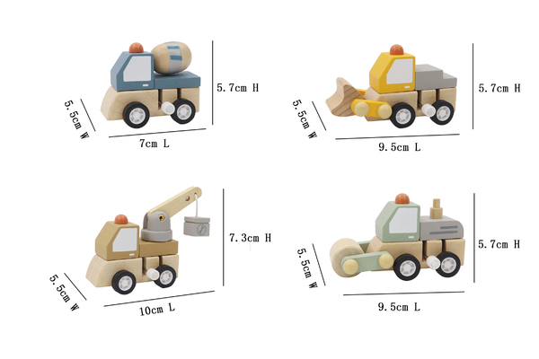Wind up your construction truck and watch it get to work! These cute construction trucks are great fun to wind up and play with, whether its on the floor or tabletop, wind them up and watch them roll. The construction trucks also have cute moving wooden parts for extra fun. Whether its the cement truck with its rolling back, the crane with its load, the roller flattening everything or the digger picking things up, you'll enjoy every movement with these vehicles. These wooden vehicles encourage open play and pretend play. By creating their own story, children explore the world around them and learn to problem solve and encourages social interaction. Each wooden wind up construction truck from is made from timber, finished to the highest quality and painted in child safe, non toxic paint.