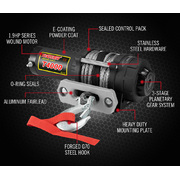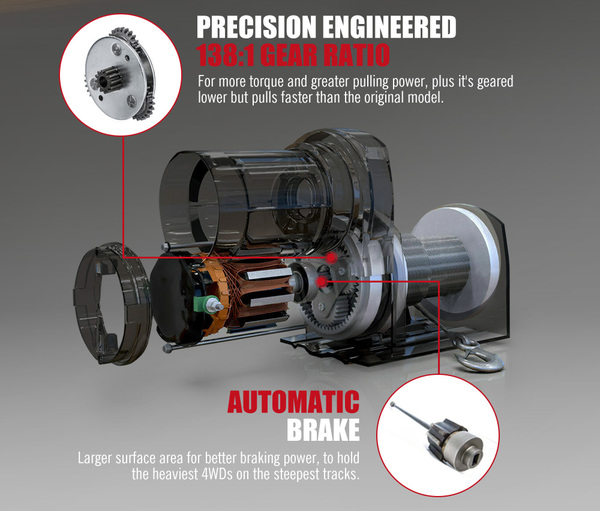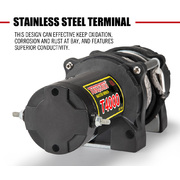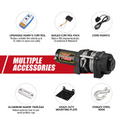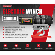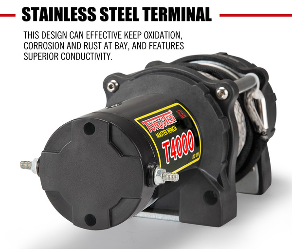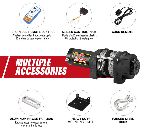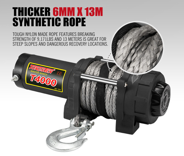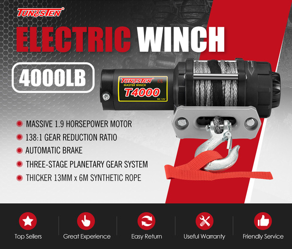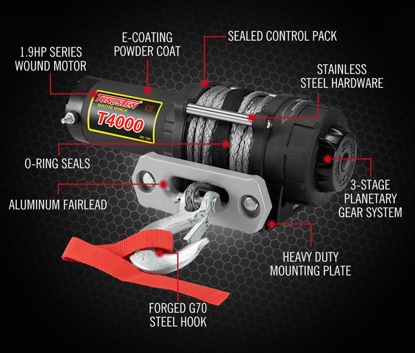 Monstrous Pulling Capacity: A 1.9 HP DC motor delivers an impressive pull rating of 4,000 lbs to recover your stuck ATV and UTV.Easy Installation: This wireless winch kit includes everything you need to start winching, and an user manual is attached for easier wiring. Superior Durability: Made of aluminum with e-coating, this electric winch is rust and corrosion resistant and ideal for all kinds of complex situations.CUpgraded Remote Control: It also comes with a wireless controller that extends up to 35 meters to secure your safety and avoid getting things tangled up.Waterproof Construction: Rated IP-67 in element resistance, its motor and sensitive parts are waterproof so that it can be of better use in all weather conditions.Stronger Gear Ratio: High-performing reduction ratio of 138:1 and a 3-stage planetary gear system make it very hardcore and offers the best gearing options.Solid Braking: There is an automatic brake for safety, which is designed to lower the rope slippage when power fails, giving the best results in all conditions.Tough Synthetic Rope: Tough nylon made rope features breaking strength of 9,171lbs and 13 meters is great for steep slopes and dangerous recovery locations.Free Spooling: The upgraded clutch allows you manually spool the synthetic rope from the drum, which will add more convenience for daily use.Stainless Steel Terminal: This design can effective keep oxidation, corrosion and rust at bay, and features superior conductivity. Capacity: 4000lbs(1812kgs)single line Motor Power: 1.9HP/1.4kw Permanent magnetic motor 12V DC Gear Train: 3 stage planetary Gear ratio: 138 : 1 Rope: Synthetic rope: Dia.6mm x Length 13m Drum size: 40mm x 72mm Bolt pattern: 124mm x 76mm Dual Control Mode: Wireless (35 meters) / Wired (1.8 meters) Full Load Line Speed (m/min): 1.74mMax Current at Full Load (A): 90Package Dimension: 35cm x 15cm x 22.5cmGross Weight: 10kg1 x TUNGSTEN4x4 4,000lbs Electric WinchClear1 x Synthetic Rope ; 1 x Mounting PlateClear1 x Wired Controller ; 1 x Wireless Remote ControllerClear1 x Hawse ; 1 x HookClear1 x Winch Relay ; 1 x Screw & Nut KitClear1 x User Manual
