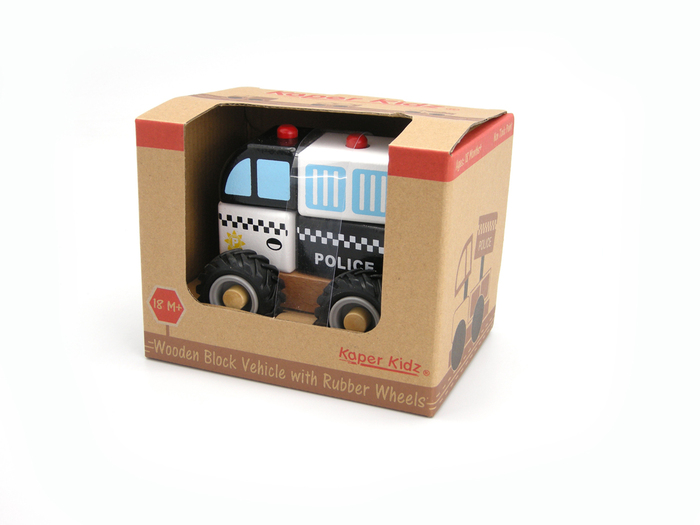 A well made with police car with rubber wheels. A wonderful push toy. Wooden blocks can be taken off to use as stacking blocks. Kids will have hours of fun pretending to be a police officer. Small enough to take when going out .