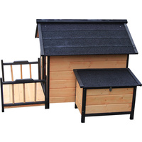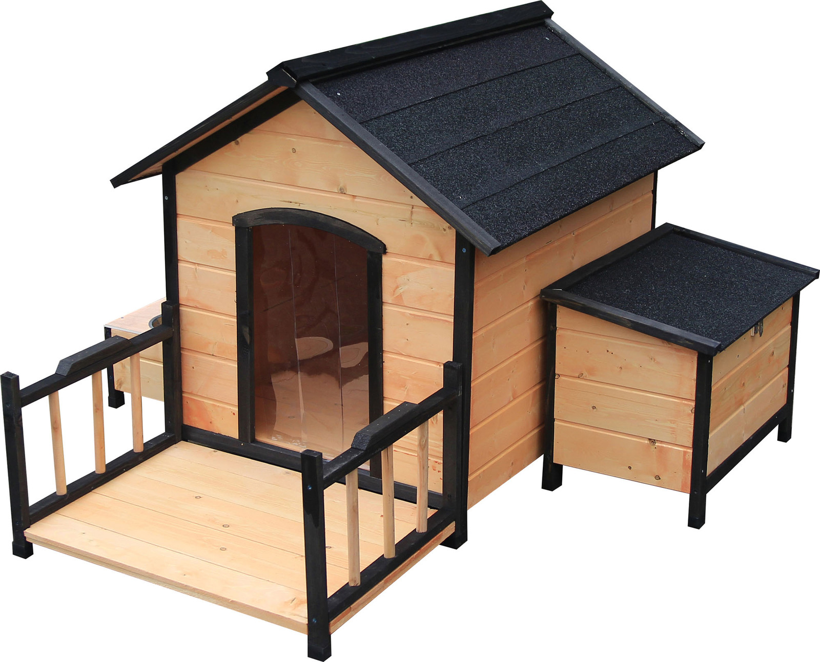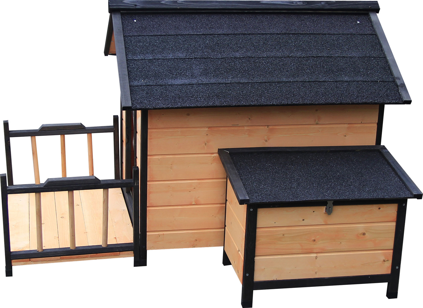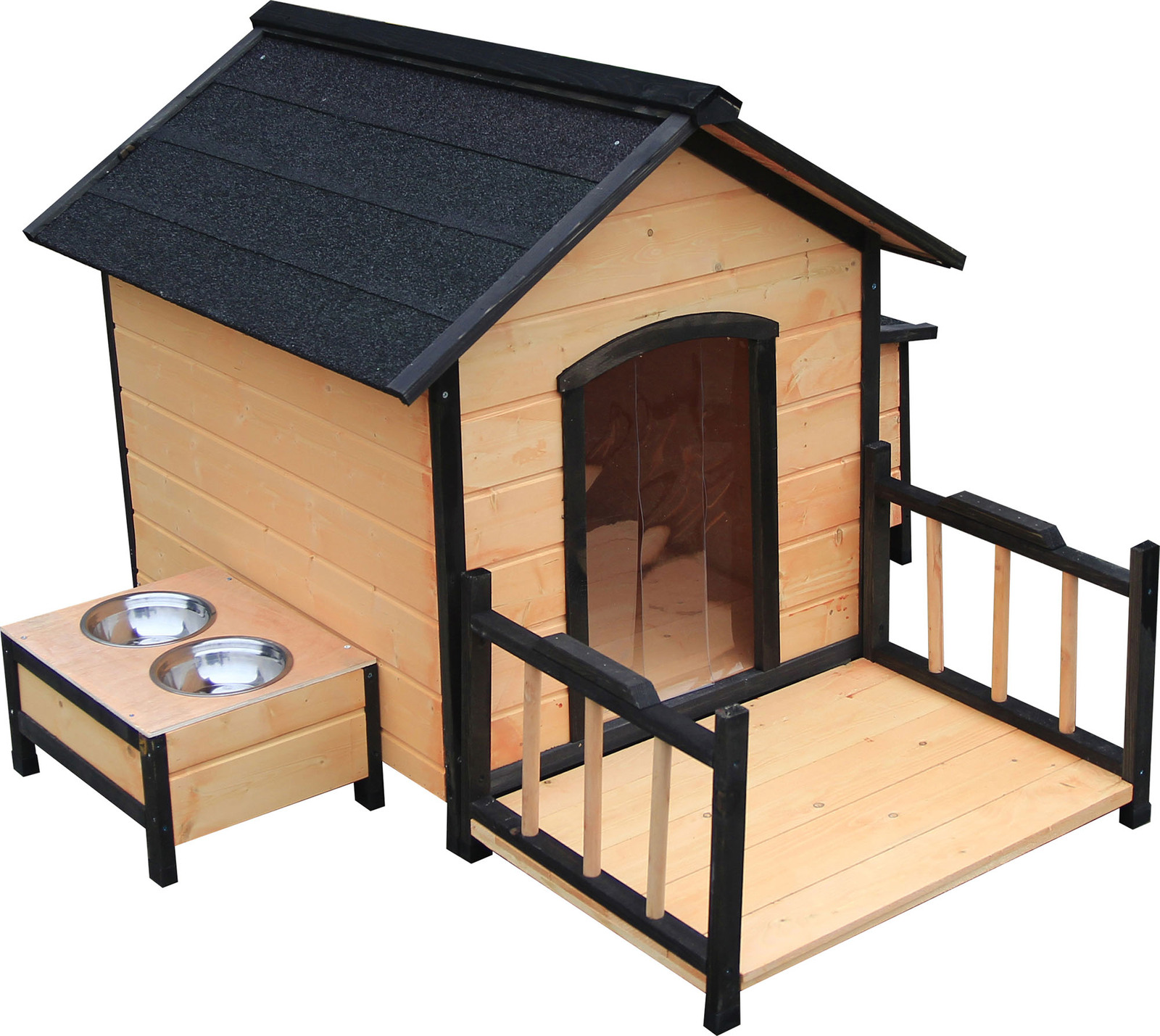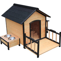 | Give your dog their own private sanctuary that both prioritises comfort and attractiveness! This handsome pet crate gives your furry buddy room to move around or take a nap inside or outside. This Modern Dog House w/ Deck and Feeder is constructed from sturdy fir wood with asphalt felt roof, it insulates your pup from the heat during summer and against the rain in winter. High quality, anti-termite, pest-resistant and is made of TUV approved eco-friendly materials. It is built with a spacious deck that provides an extra space for your pup for some sunshine! So hurry and treat your furry family member luxurious comfort with their new home today! FEATURES AND SPECIFICATIONS: Height Adjustable Feet Spacious & Comfortable Weatherproof Lined Roof Removable Plastic Door & Floor Constructed With High-Quality Natural Fir Wood Made From TUV Approved Eco-Friendly Materials Asphalt Roof for Maximum Protection Against Rain & Sun Feet with Waterproof Rubber Cover for Moisture Protection Equipped With Detachable Storage Box, 2 Food Bowls & Patio Dog Bed |